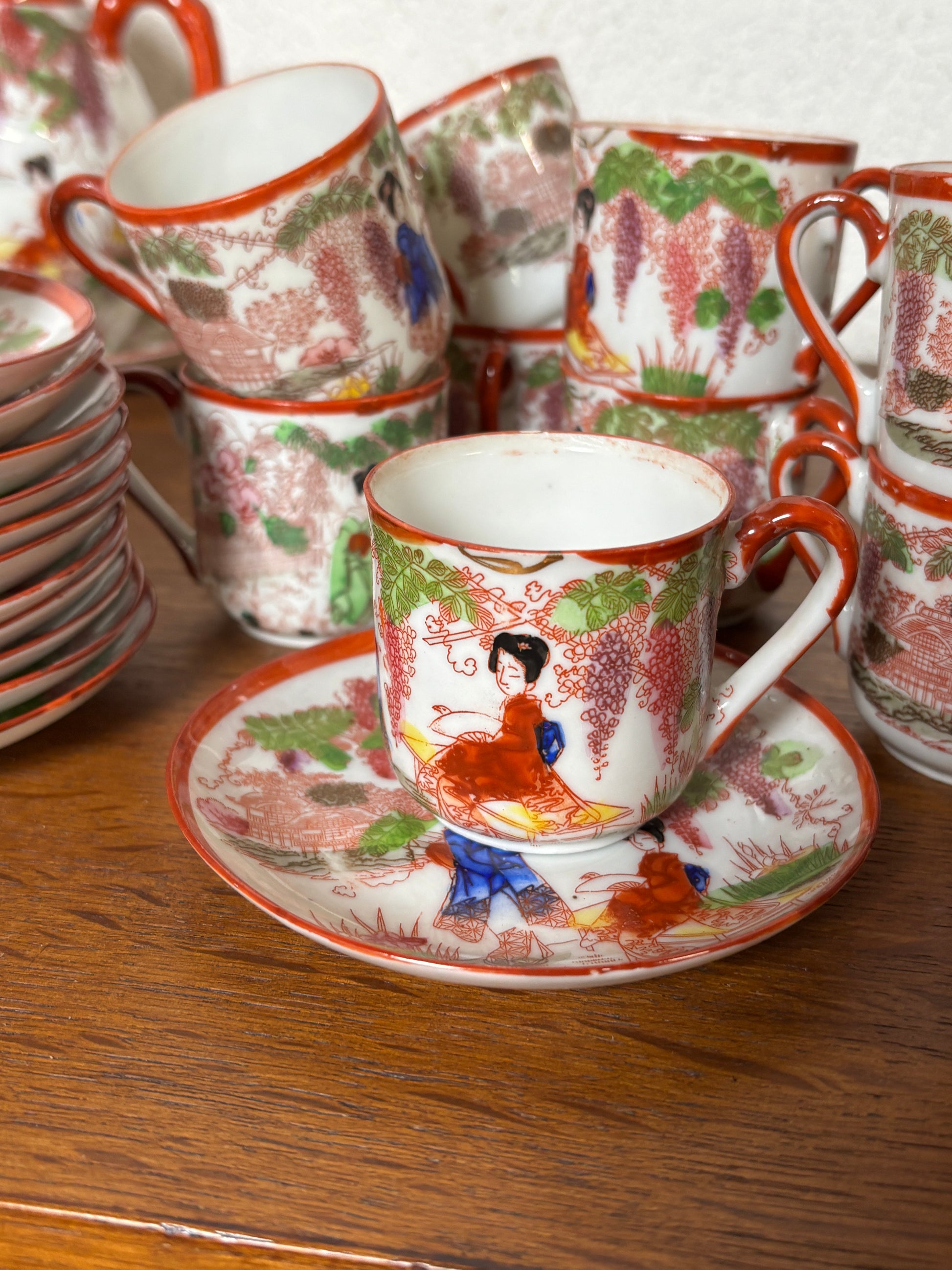 Ce somptueux service japonais en porcelaine fine « coquille d’œuf » se compose de 12 tasses et leurs sous-tasses assorties, accompagnées d’une théière, d’un pot à lait, d’un sucrier et d’un coquetier. Réalisé dans une porcelaine d’une extrême finesse, presque translucide, il incarne toute la délicatesse et le raffinement de l’art de la table japonais.